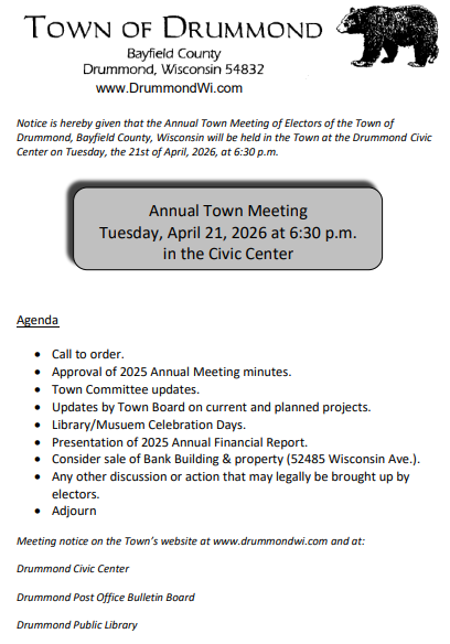 Town of Drummond Annual Board Meeting PDF LINK HERE The regular monthly town board meeting will follow directly after. Drummond LibraryApril 10, 2026Drummond Civic Center Facebook0 Twitter LinkedIn0 Reddit Tumblr Pinterest0 0 Likes